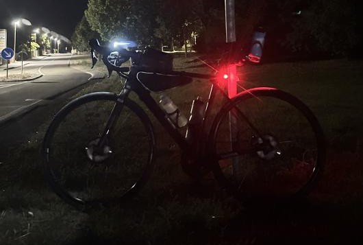 Ich war ohne großes Gepäck nach Erfurt unterwegs. Am Rad eine Oberrohrtasche für Handy, Brieftasche, Ladekabel, kleine Powerbank, Lesebrille und Magnesium. Eine Tasche für das vordere Rahmendreieck für Riegel und Kleinkram. In den Trikottaschen Riegel, Windjacke und einen Ersatzmantel und in der Satteltasche das übliche mit Schlauch, Mini-Tool, Flickzeug. Zusätzlich war in den aufgezogenen Schläuchen ein wenig Dichtmilch, 2022 machte sich das bezahlt. In der Garmin-Halterung steckte das Navi und unten drunter der passende Zusatzakku. Im Rahmendreieck steckten 2 Flaschen Wasser (ca 0,7 + 0,6) mit Getränkepulver und je einer Prise Salz, am Sattel hatte ich ebenfalls wieder 2 Flaschen zu je 0,5 Liter. Für alle Fälle hatte ich am Lenker noch eine kleine Akku-Lampe, hinten hing das Garmin Radar und als Reserve hatte ich ein Sigma Blaze am Sattel – aber noch nach vorn gedreht damit es nicht das Radar behindert.